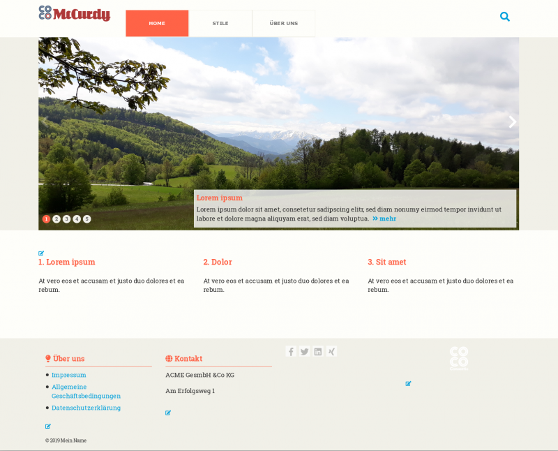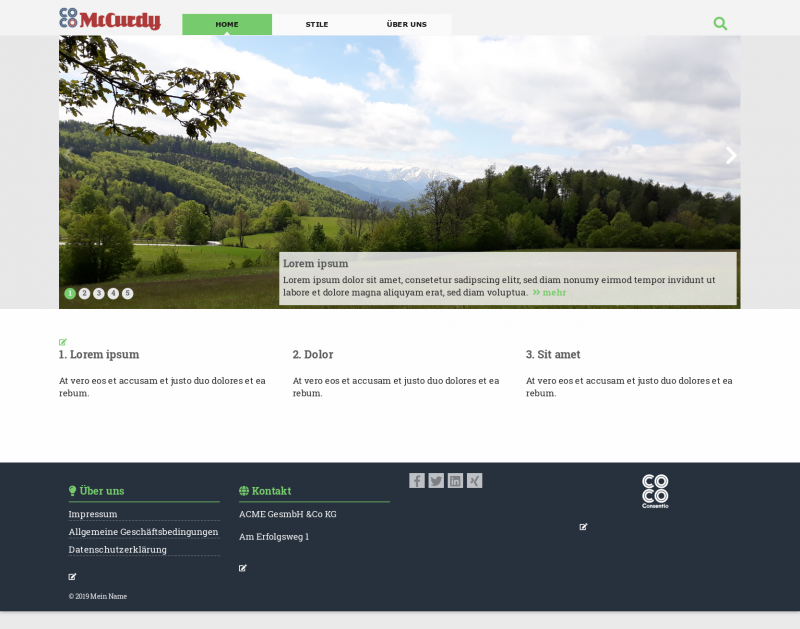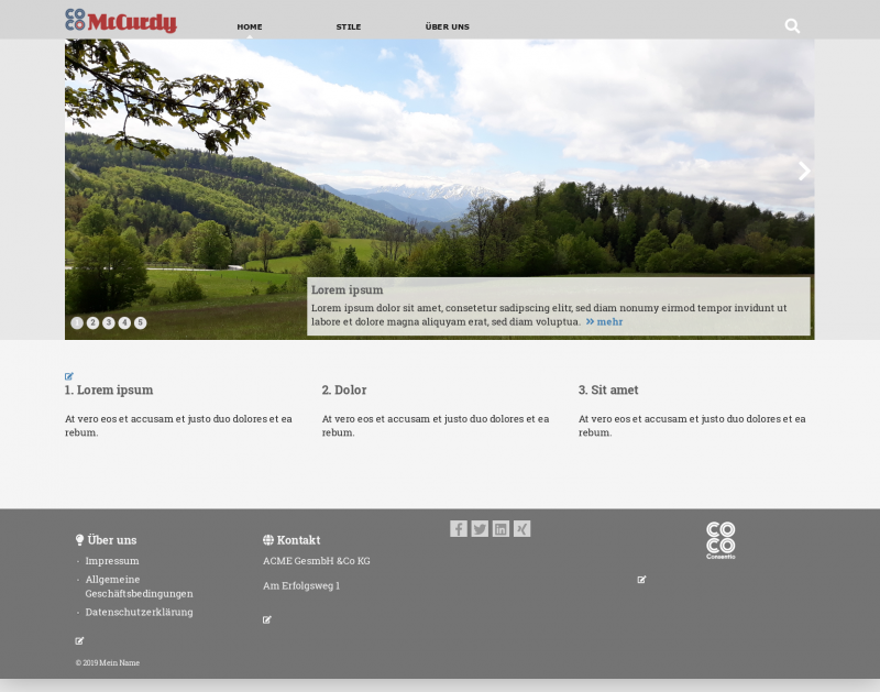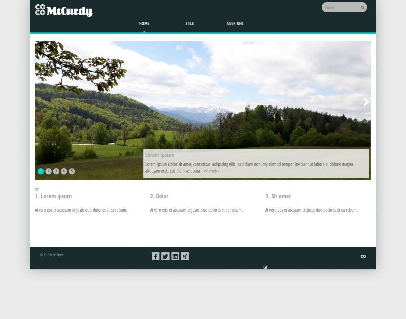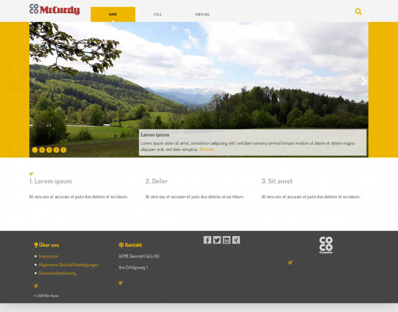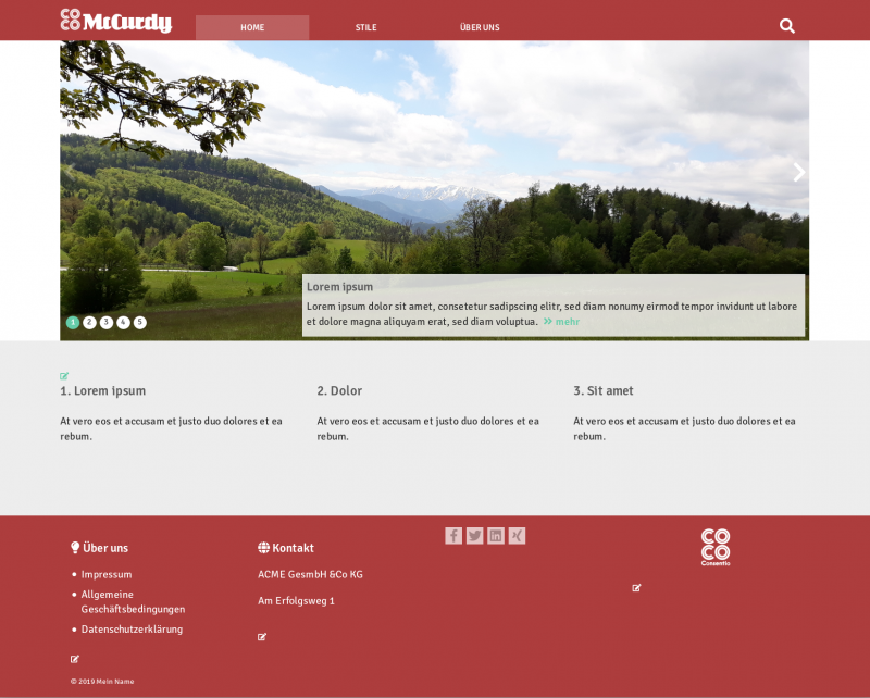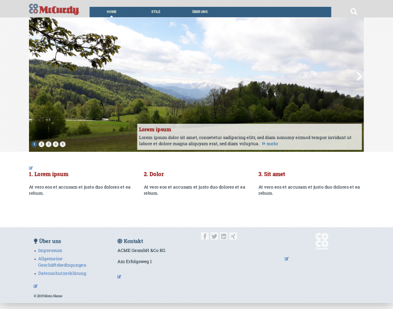 Die Beispiele sollen eine Vorstellung geben, wie die einzelnen Designs wirken. Wobei ein gewöhnliches Setting für eine Startseite gezeigt wird, die aus einem Karussell (kann auch eine Emotionsbild sein) und einem verkürzten Content-Bereich besteht.